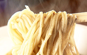 | ●スープ | シロクチ カタクチ ヒラゴ 3種類の煮干しを繊細な火加減でだしを取り その後冷やし、ミキサーで細かくし 旨みを一滴も残さず抽出 濃口しょう油ベースの特製しょう油ダレと合わせる |