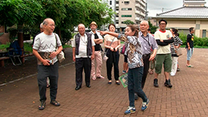 彼らを招いたのは、阪神淡路大震災(1995年)を経験し、長田区の災害復興住宅に住んでいる 今滝一恵さん。地元で愛されていた祭「地蔵盆」を復活させた女性です。今滝さんから友人・山田さんにあるプロジェクトへの参加の誘いがあり、保存会のメンバーの神戸行きが実現。湊川神社(神戸市中央区)の舞台で、“岩戸入り”を舞いました。