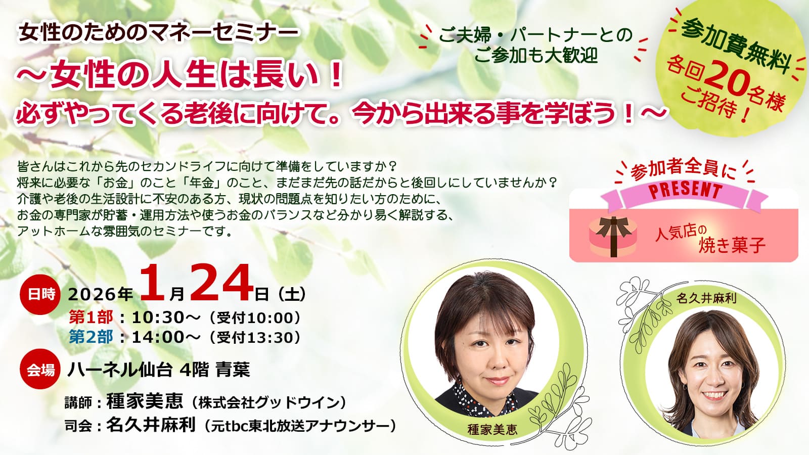 介護や老後の生活設計に不安のある方、現状の問題点を知りたい方のために、お金の専門家が貯蓄・運用方法や使うお金のバランスなど分かり易く解説する、アットホームな雰囲気のセミナーです。