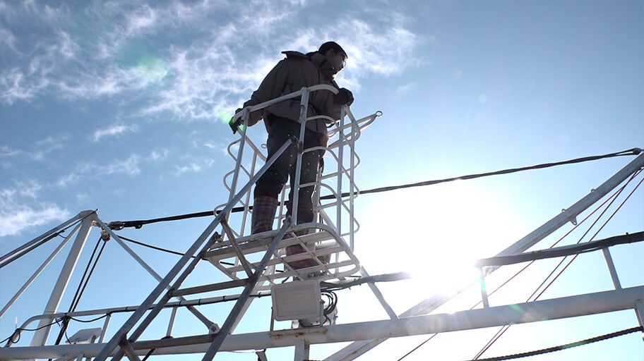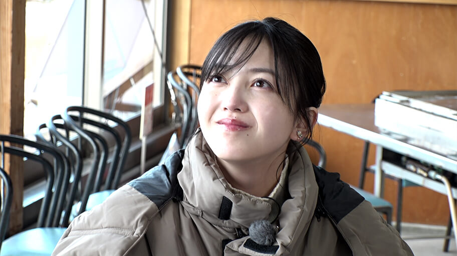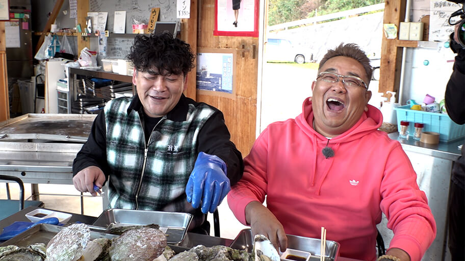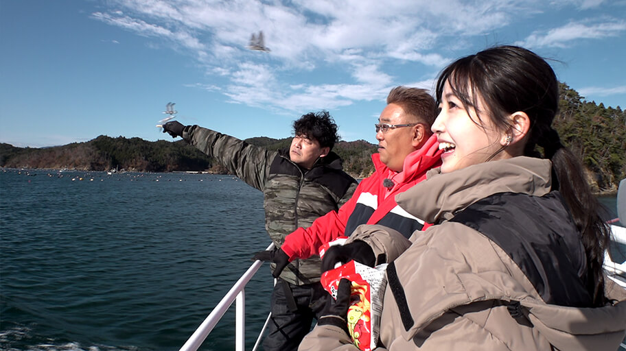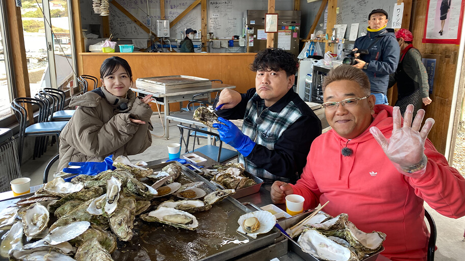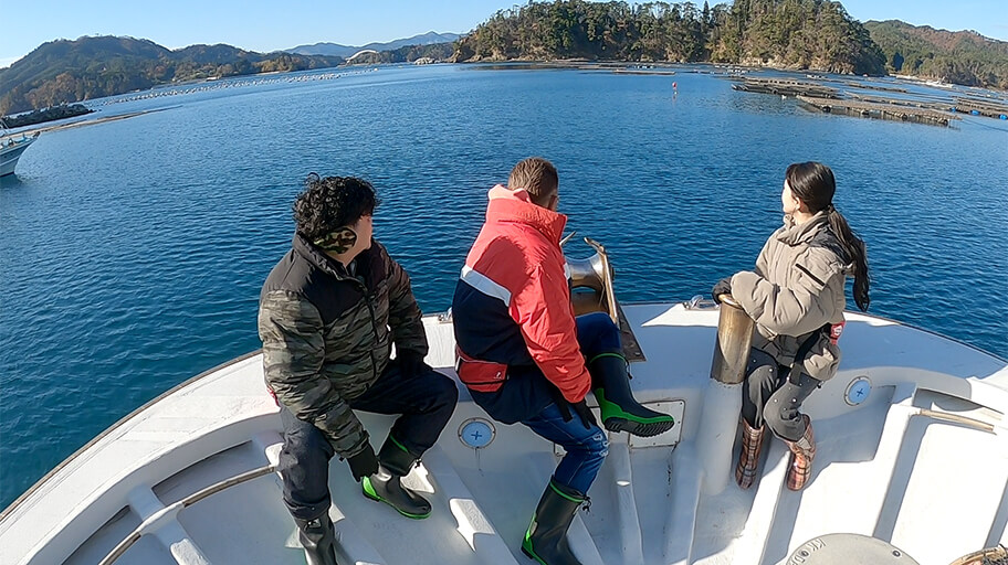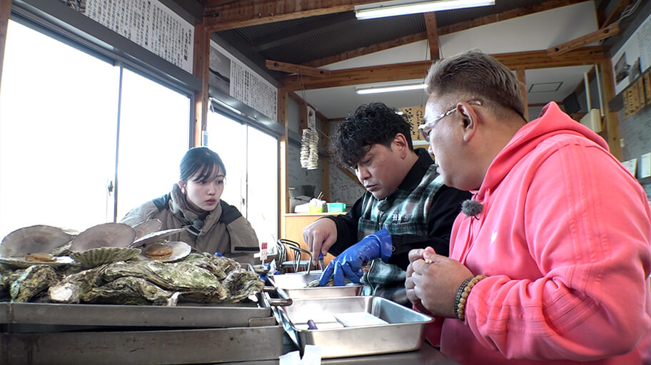 漁港の近くを散策していた一行が出会ったのはカキ漁師。