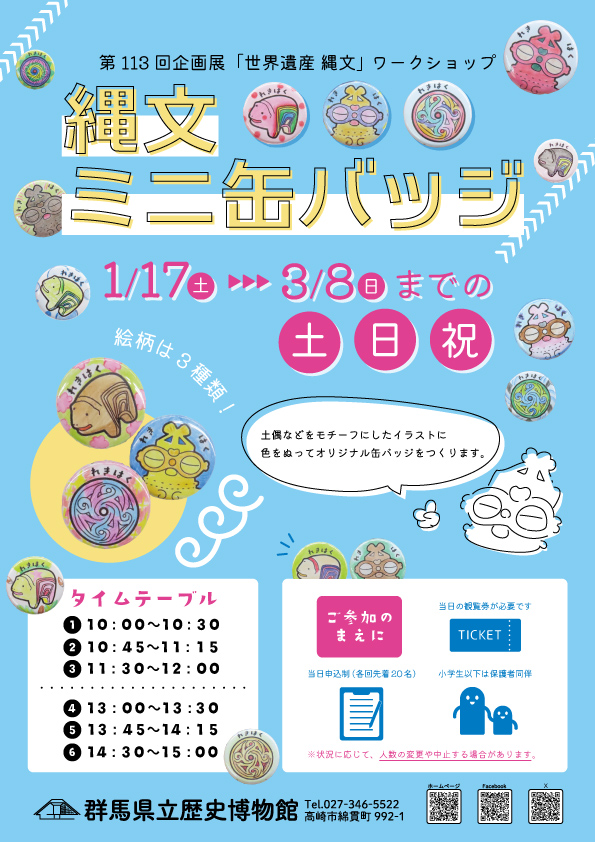 土偶などをモチーフにしたイラストに色をぬってオリジナル缶バッジをつくります。