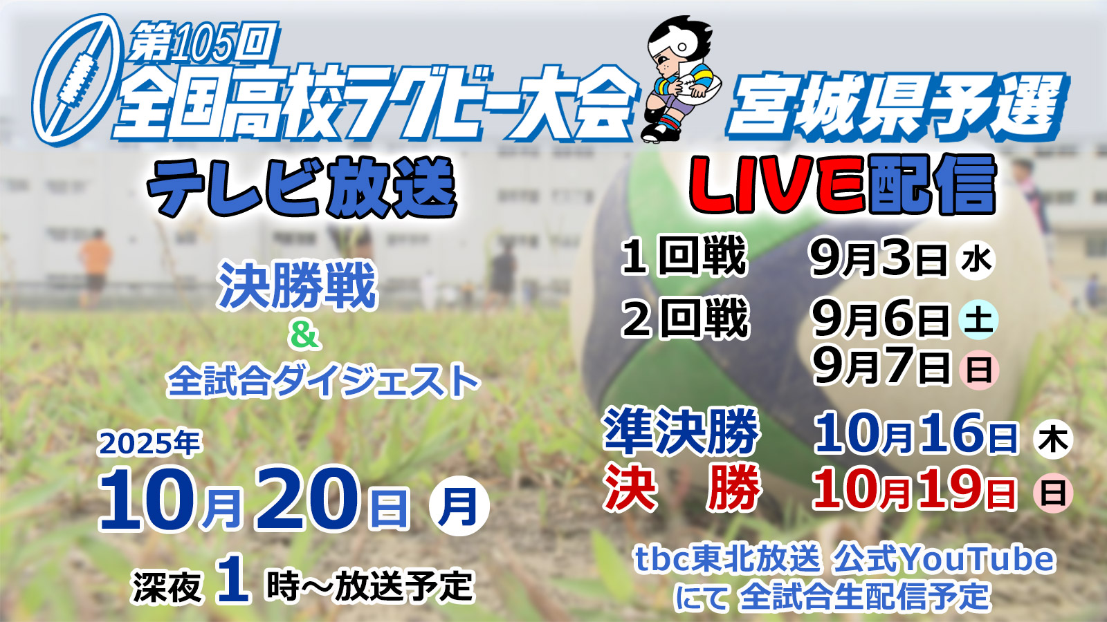 聖地花園へと続く全国高校ラグビー大会宮城県予選!フィールドで繰り広げられる高校生ラガーマンたちの真剣なプレー。そこから噴き出す熱い情熱。
