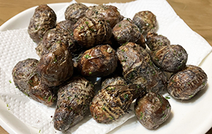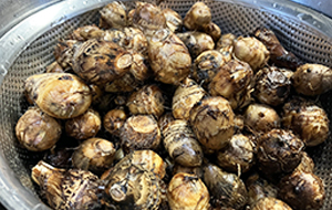生産量が少ないことから幻と称される里芋。レンジで温めた後、米粉をつけ油で揚げる。のり塩で味付けして完成。