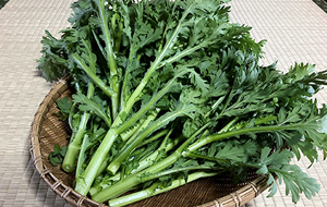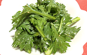 レシピは2人前。春菊1束(150g)を食べやすい大きさにカットし、醤油、酢、ごま油大さじ1、砂糖小さじ1、塩コショウ少々、白ごまと和えたら完成。