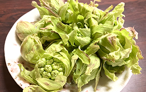 重曹を入れたお湯で2分茹でたふきのとう60gをみじん切り状にして油で炒める。味噌120g、砂糖大さじ6、みりん大さじ2、唐辛子を和える。