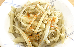 ヤーコンを細切りして軽く水にさらしたら、空炒りして水気を飛ばし、油で炒めて麺つゆで味付けして完成。