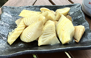あく抜きしたタケノコを塩コショウと気持ち多めのバターで炒める。 タケノコは、あく抜きの時に米ぬかは使わず、お湯で茹でて根元の部分に竹串が刺さればベスト。
