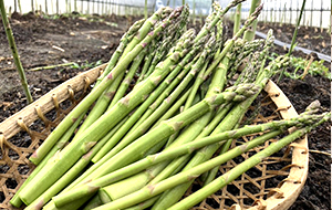 断面がみずみずしいアスパラの根もとの部分の皮をむいて、そのまま食べるだけで口いっぱいに甘みが広がる。
