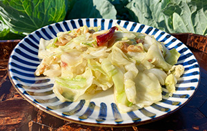 スライスしたニンニクをオリーブオイルでこんがり焼いたら、食べやすい大きさに切ったキャベツと一緒に炒める。 味付けはアンチョビのみ。パスタと一緒に炒めても◎