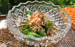 ヘタを取った万願寺甘とうがらしを食べやすい大きさにカットし、フライパンで軽く焼いたら少々の水を入れ蒸し焼きに。 柔らかくなったらポン酢をかけ、仕上げにかつお節を乗せて完成。