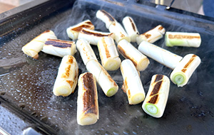 等間隔に切ったねぎを焼くだけ。斜めに切れ込みを入れておくのがポイント。 口の中でねぎの芯だけが飛び出ることがなくなります。