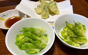 祝蕾を一口大に切り30秒ほど茹で、マヨネーズをかけて完成。クセがなくコリコリとした食感が楽しめます。