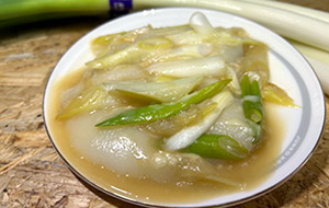 2~3cm幅に切った曲がりねぎをフライパンに敷いて切り餅を乗せる。 その上にねぎを乗せて中火で約10分蒸し焼きにし、麺つゆで味付けしてスライスチーズを乗せて溶けたら完成!