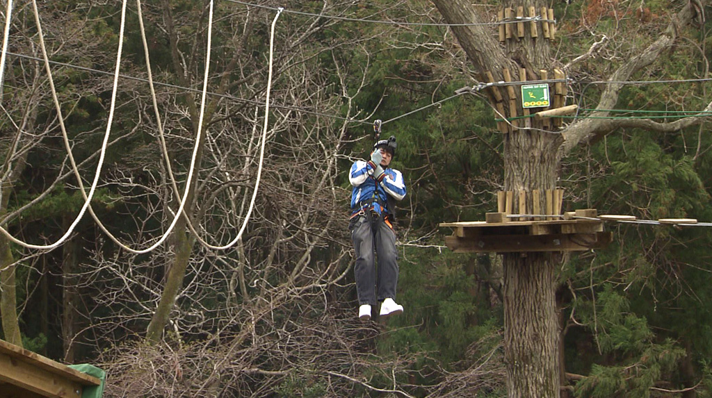 最長100メートルのジップラインがある、自然豊かなアスレチック施設。超難関のコースに佐藤アナが…。