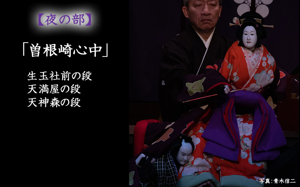 元禄16年(1703)、露天(つゆのてん)神(じん)社(大阪市北区)で起きた心中事件を題材として、その一月後に竹本座で初演され、大好評を博した近松門左衛門の世話物第一作。それまで歴史や伝説といった過去の物語のみを題材として来た浄瑠璃に、同時代の身近な事柄を描く新分野「世話物」を確立した、画期的な作品です。現在上演されているのは、1955年に、野澤松之輔の脚色・作曲により大阪の四ツ橋文楽座で復活上演されたもので、原作のままではありませんが、海外での評価も高く、文楽を代表する演目となっています。 醤油屋の手代徳兵衛は、天満屋の遊女お初との愛を貫くため、主人からもちかけられた縁談を断固として拒絶。激怒した主人に命じられたのは、継母が知らぬ間に話を決めて受け取っていた持参金を返すこと、そして、大坂追放でした。お初に会えなくなる危機。継母から取り戻した金を早く返して、主人の気持ちを和らげたい…。ところが、その大切な金を友人の九平次にだましとられたうえ、衆人環視の中、証文偽造の罪を着せられ、打ちのめされるはめに。金も面目も失い、もはや生きてはいられなくなりました。 その夕方、天満屋では、早くも徳兵衛の噂でもちきり。お初は、店の外で死の覚悟を告げる徳兵衛を裲襠(うちかけ)の裾に隠し、ひそかに店の縁の下に忍び込ませます。九平次の中傷に怒りで身を震わせる徳兵衛。一緒に死ぬとの言葉とともに足で返事を促すお初。徳兵衛はその足を押し戴いて涙。このように、誰にも気づかれず、足で心を確かめあった二人は、深夜、店を抜け出し、曾根崎の天神の森で心中しました。 縁の下と女性の足を見せる演出が独特の「天満屋」。「この世の名残、夜も名残…」、名文と讃えられた「天神森」の道行。哀しくも美しい心中場面。二人の心情がまっすぐに伝わって来る舞台です。 |