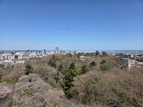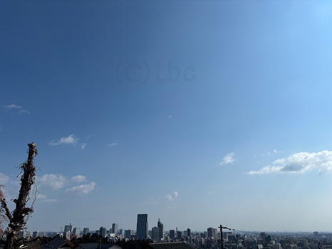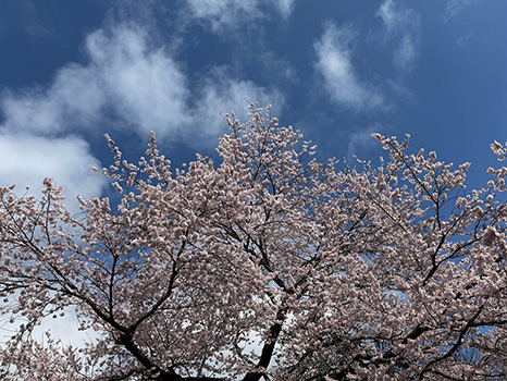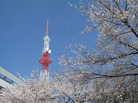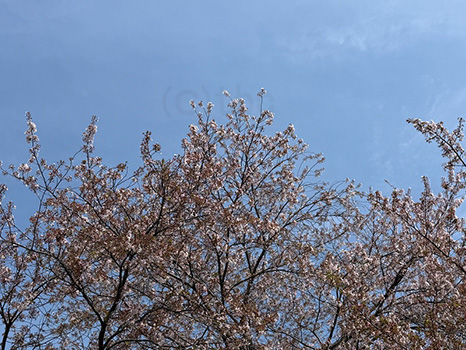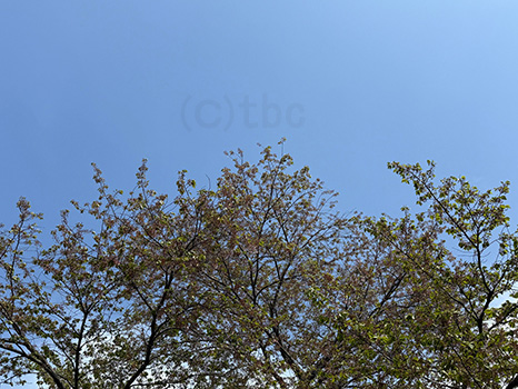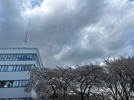 すっきり青空で日差したっぷり。tbc構内のサクラもだいぶ見ごろとなってきた。