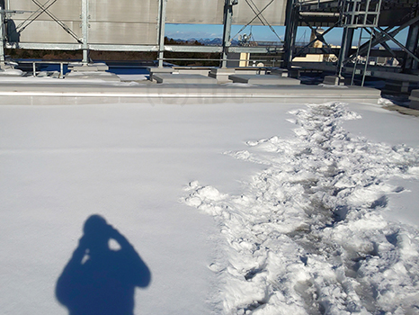 日差しが暖かく感じられるが、屋上の雪はまだまだたっぷり残っている。