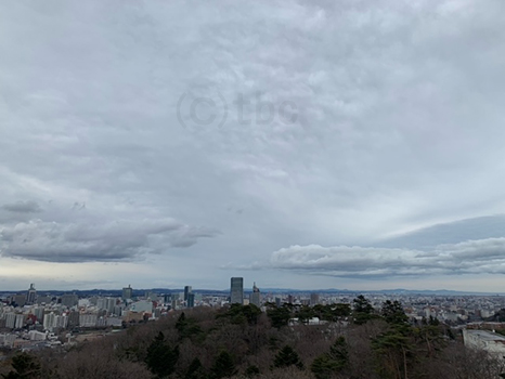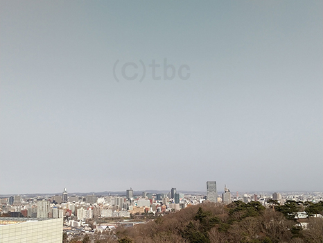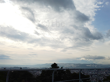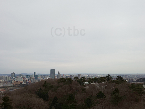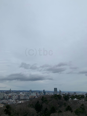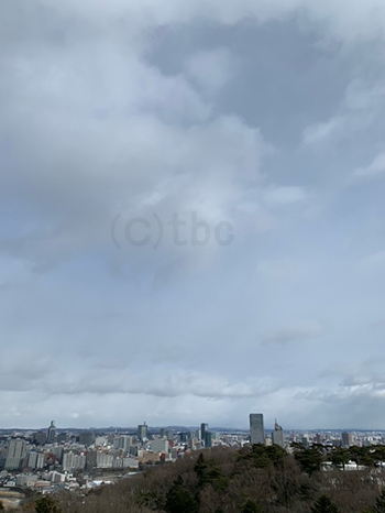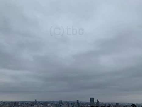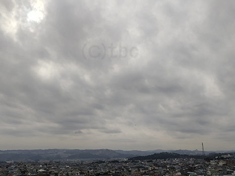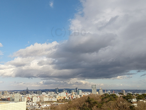昼過ぎの仙台市内。東の方向に少し青空も見え、明るい曇り空。