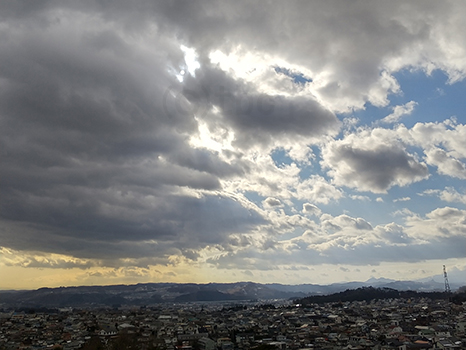 寒冷前線が通過中で雲が多いが、少し晴れ間も見える空。