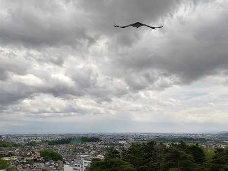 カラスは子育ての時期なのか、写真撮影する最中、しきりに頭上を低空飛行。 最初は1羽だったのが、すぐに1羽加わったことから、身の危険を感じ、すぐに建物の中に避難した。