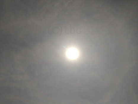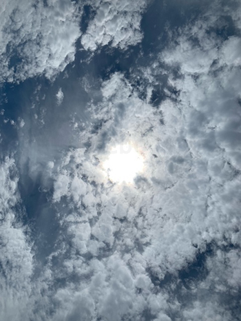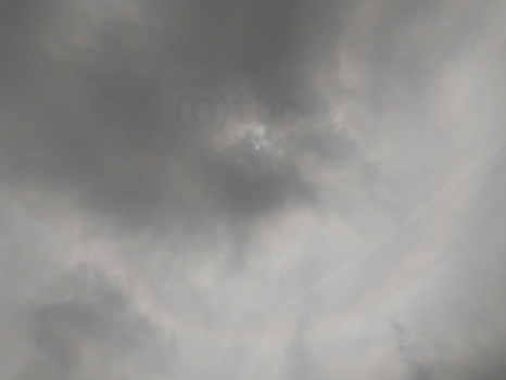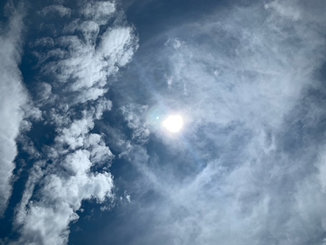 太陽の周りは雲が多いが、よく見ると、太陽の下に日暈の一部がみられる。