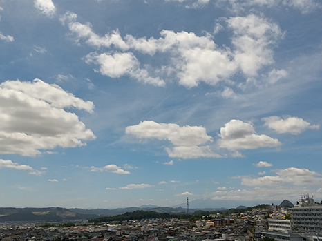雲多いが青空見られる。県南では雨が強まっている所もある。