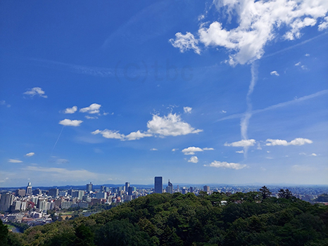 午前11時過ぎ。青空に点々と上層雲が浮かび、秋っぽい空模様だが日差しの強さは真夏。