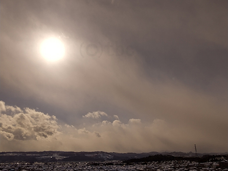 山の方ほど雪雲が広がり、流れてくる雪で、太陽がぼんやり。