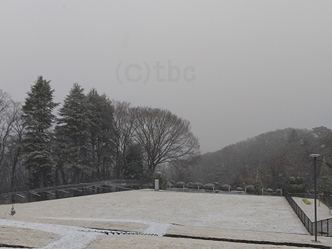 べちゃべちゃの雪で、芝生の上は白くなってきたが、路面に積雪はない。