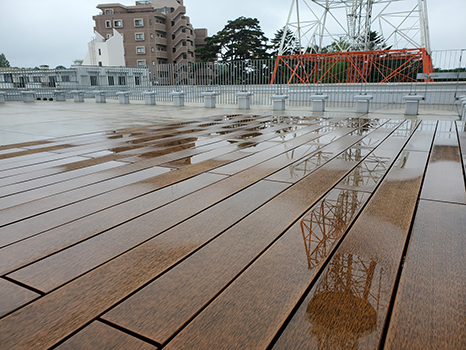 弱い雨が降ったりやんだりで、デッキもしっとり濡れていた。