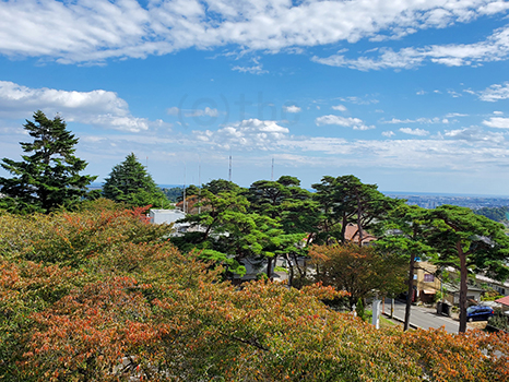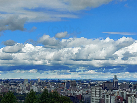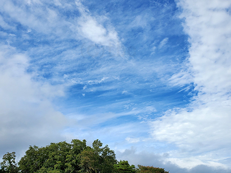 青空が広がり、白や灰色の積雲が浮かぶ秋らしい空模様。