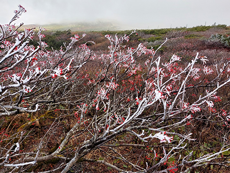 取材で訪れた蔵王の山頂付近では草木に霧氷がびっしりと付いていた。