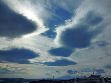 西の空にはレンズ雲のような扁平な雲が多く見られる。