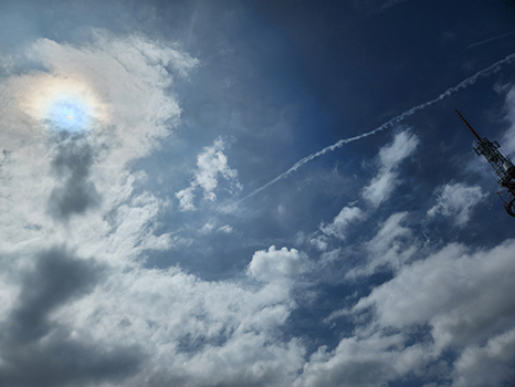 上空高い所も湿気がやや多いのか飛行機雲が消えずに残っている。