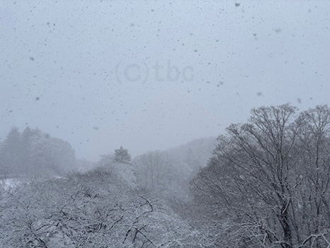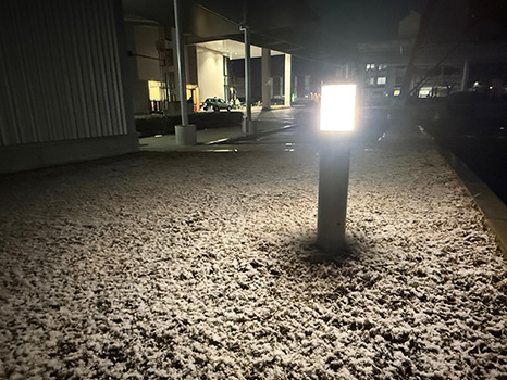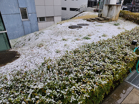 午後3時前には一時的に大粒の雪が降り植え込みが白くなった。