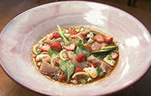 一見ラーメンには見えないのですがもちろんこれがおいしい!鶏ガラ・トマト・バジル・ いちごのスープは抜群です。
