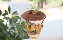 錦特製 乃し梅のパフェは、その名のとおり山形の老舗佐藤屋の完熟梅の銘菓“乃し梅”を使用。乃し梅のジャムに自家製生チョコがバランスよく、パンケーキ、グラノーラが層になった至高のパフェです。