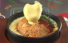 映えメニューたっぷり!おなじみのチヂミはたい焼きの形。キムチチーズチャーハンには鳥がのっていて持ち上げてみると…中から卵黄がうまれる遊び心も。