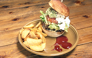 つなぎを使わない100%ビーフのパティにチーズ、新鮮野菜とソース。