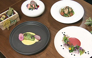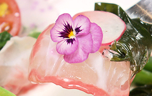 ビーツで酸味のあるピンク色のソースと地元でとれた新鮮な真鯛に雄勝ローズファクトリーガーデンの食べられる花がアクセントの美しい一皿も