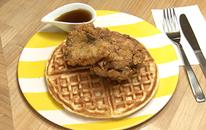 レモンの風味がいいカリッと揚げたてチキンを、こだわりが詰まった焼きたてほんのり甘いワッフルにON。