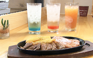 もちろんタコライスも人気です。沖縄名物のスパムと豚肩ロースの鉄板焼きのコンビは、お酒もすすむ夜限定メニューです。