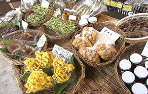 山菜、きのこ、川魚など山の恵みを販売。いまは夏においしいキノコがずらり。滋養強壮によいといわれる乾燥マムシも…