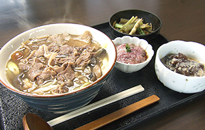 いのしし鬼そばは、やわらかくて脂身もおいしいイノシシ肉に6種類のきのこがたっぷり。