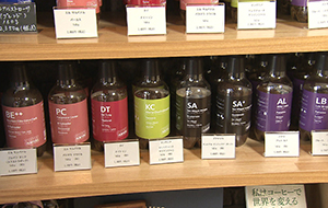 風味を損なわないためのボトルで販売している珈琲豆はカラフルでスタイリッシュ、贈り物にもおすすめ。好みなどをきいてアドバイスもしてくれます。