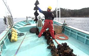 かつて気仙沼地域ではこの養殖法が盛んでしたが、手間と時間がかかることなどから廃れ、島内で天日干しを行っているのは涼太さんの家だけです。