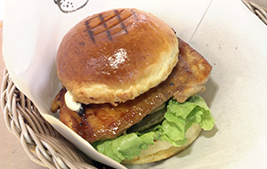 グリルチキンのバーガーも人気!さらにわんちゃんも食べられる、塩分なし玉ねぎなしのわんちゃん用のバーガーも手作りしています。
