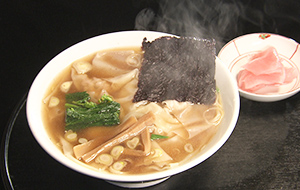 ワンタンの皮は麺と同じ材料でこちらも自家製。大きくてつるりアツアツ、生姜がアクセントです。鶏ガラと豚ガラベースしょう油味のスープはあっさり風味。東松島の海苔の香りも◎