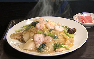 エビ焼きそばの麺はワンタンめんと同じものをすこしかために焼き、優しい塩あんをかけた満足感がありつつもからだ思いのメニュー。