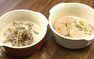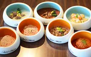 手作りしているワンちゃんのお食事メニューは牛 豚 鶏 鹿 などの肉料理がメインの8種類。素材の味をそのまま楽しめ、ワンちゃんたちもいい食べっぷりです。